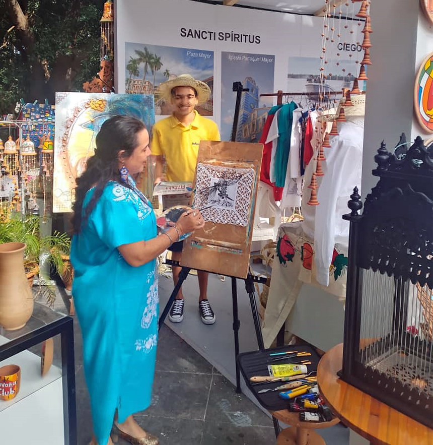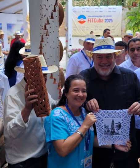 Durante estos días de Feria, Havanatur, presentó al público en su stand, la reproducción de una obra de Yudit Vidal Faife. Por otra parte, directivos nacionales y extranjeros recibieron por cortesía de la delegación espirituana, una pieza realizada en randa por la artesana-artista Magalys Ramírez, integrante de «Entre hilos… y pintada por Vidal Faife; así como un jarrón de barro realizado por Santander Alcántara.