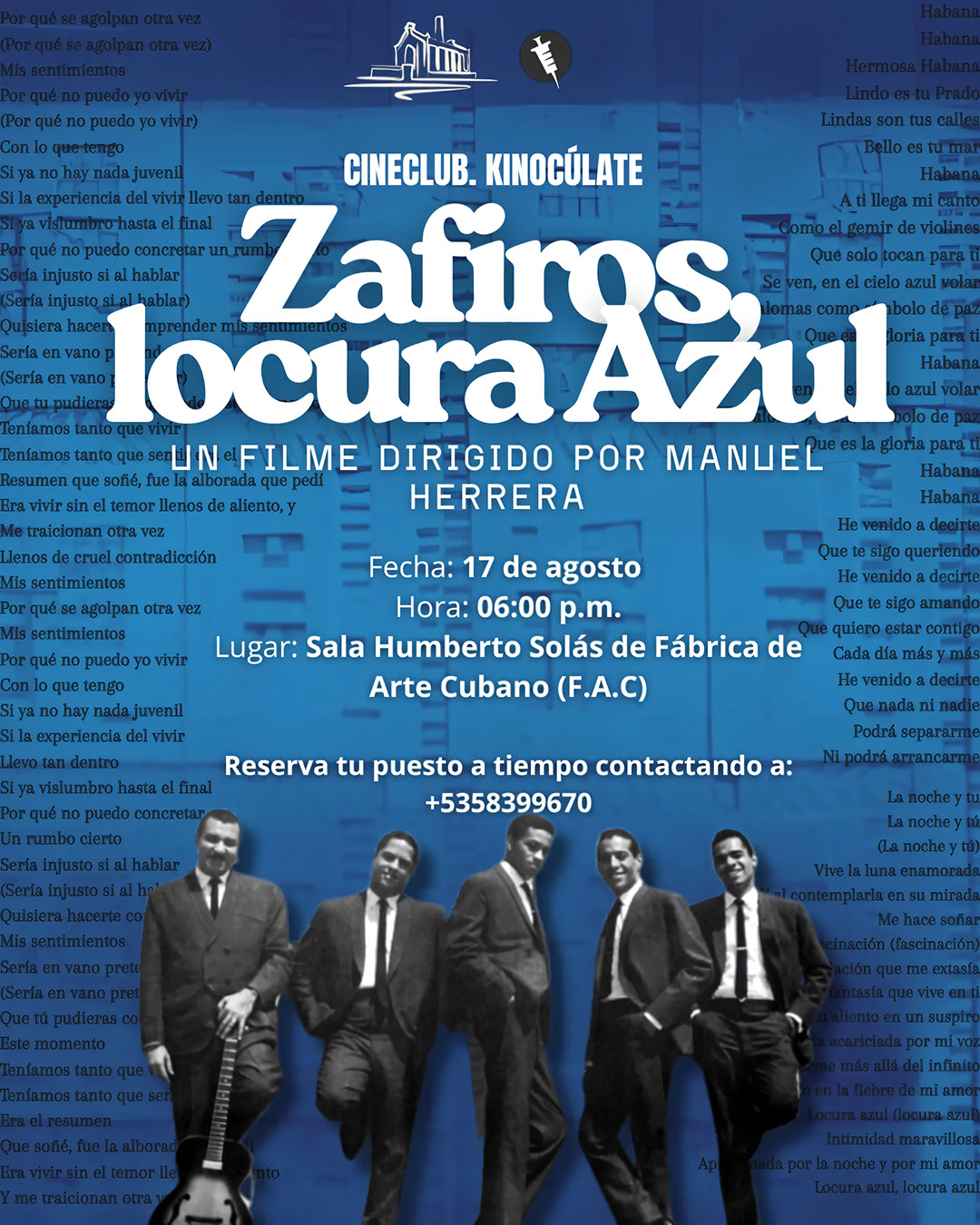 También en la jornada dominical del cineclub Kinocúlate proyectará el largometraje cubano Zafiros, locura azul, dirigido por Manuel Herrera.