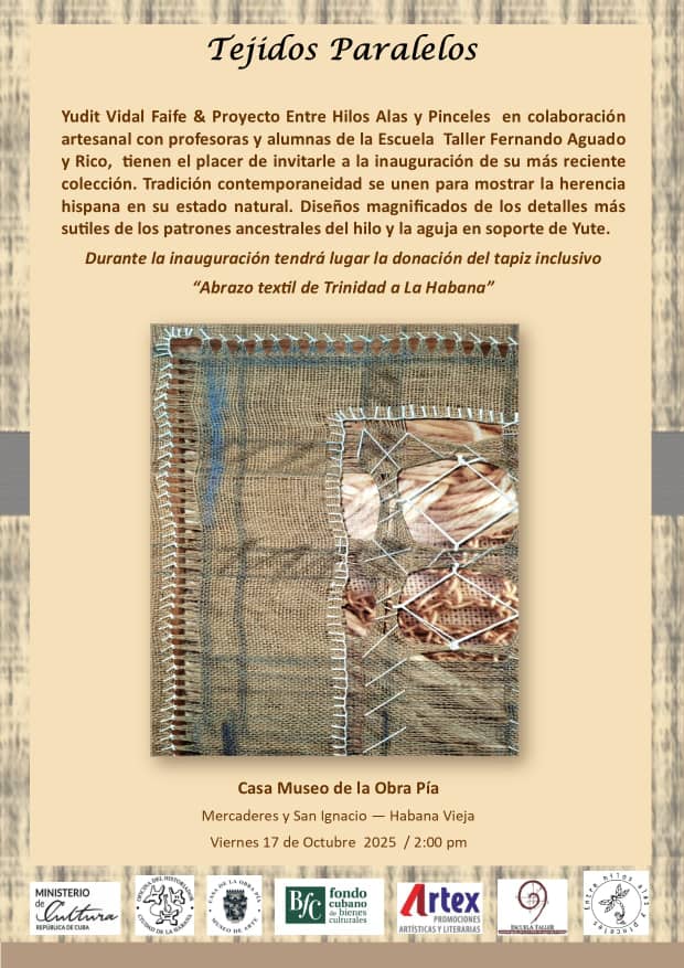 At the opening, the inclusive tapestry Abrazo textil de Trinidad will be donated to Havana. The piece was created by the artist alongside students from the Workshop School of the Office of the Conservator of Trinidad (Cuba), the participating artisans, and a group of children with special educational needs.