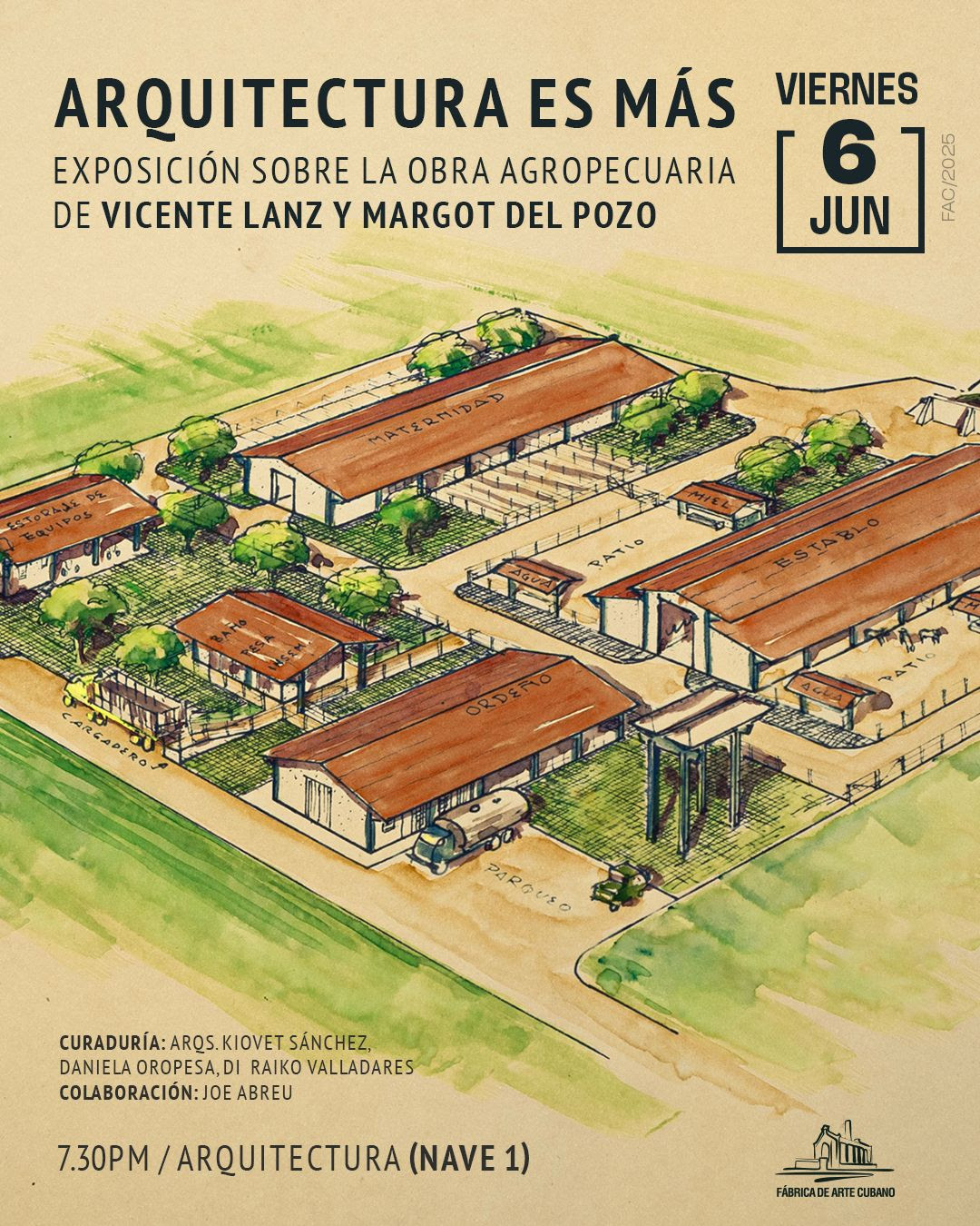 El programa para las bellas artes prepara momentos con la apertura de las exposiciones Arquitectura es más, que rinde homenaje a la innovación y el compromiso social de Vicente Lanz y Margot del Pozo, pioneros de la arquitectura agropecuaria en Cuba. La curaduría corre a cargo de Kiovet Sánchez, Daniela Oropesa, DI Raiko Valladares y la colaboración de Joe Abreu.
