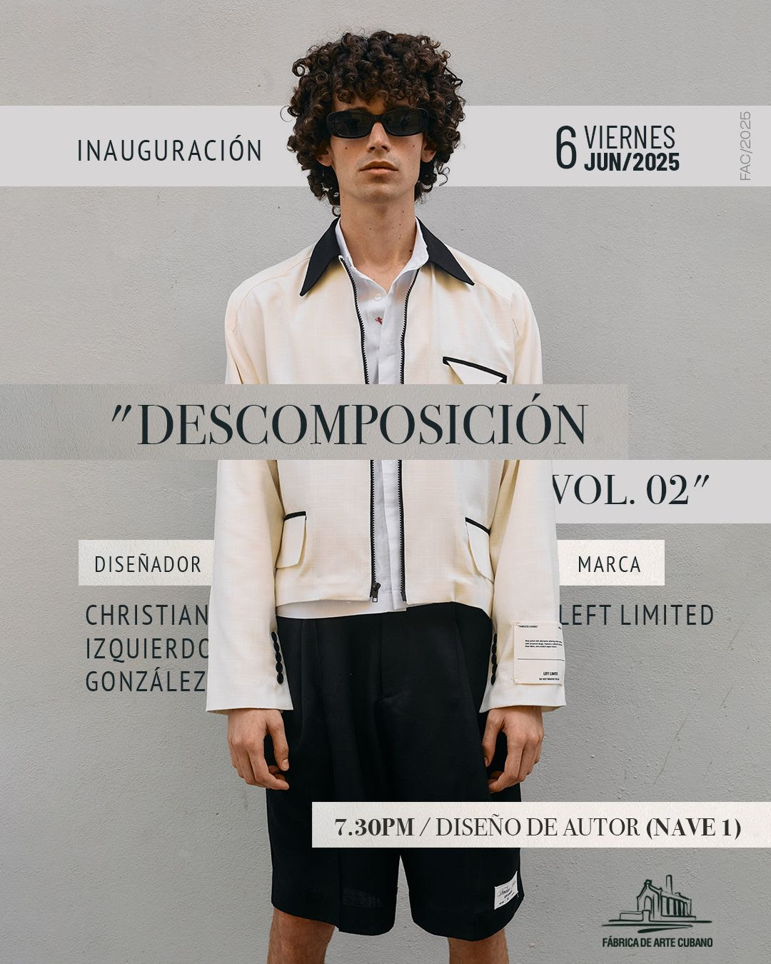 Otra muestra expositiva es la colección Descomposición Vol. 02 / Marca: LEFT LIMITED, del diseñador Christian Izquierdo González, la cual reflexiona la fragmentación y la transformación a través de técnicas de sastrería alternativas y materiales que combinan rigidez y ligereza. Predominan lienzos crudos y algodones suaves en una paleta neutra que resalta texturas y formas.